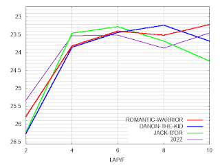 ラップタイムを見ると、やや落ち着いた入り方から、道中は平均的な流れに